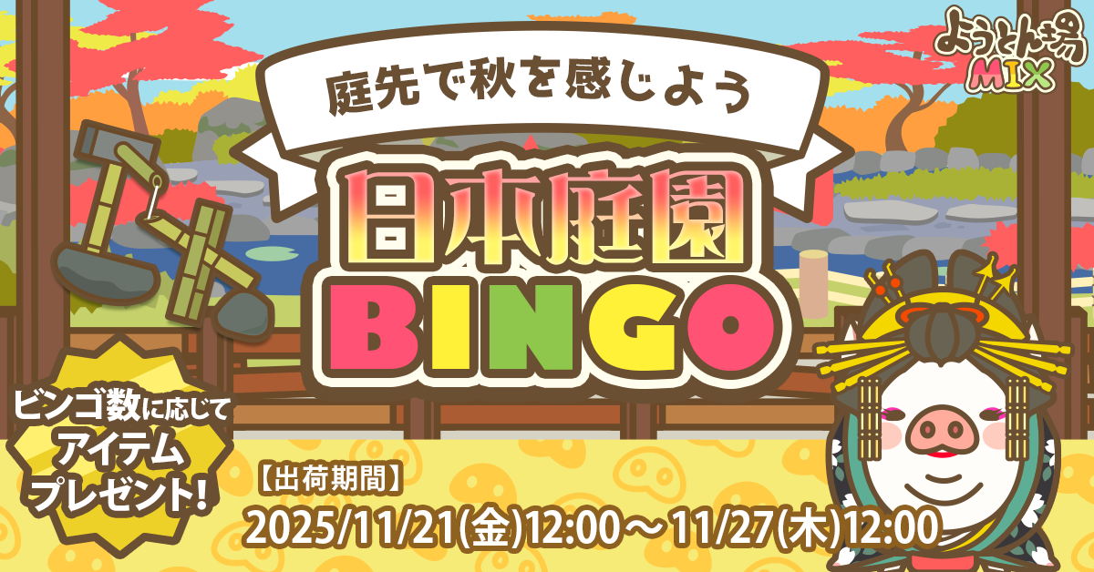 出荷時に出るナンバーでビンゴを狙おう!揃ったビンゴ列数に応じて景品を獲得できるぞ!11月21日の12:00からぶた小屋にある看板をタップして参加できるぞ!ぜひ挑戦してくれ。