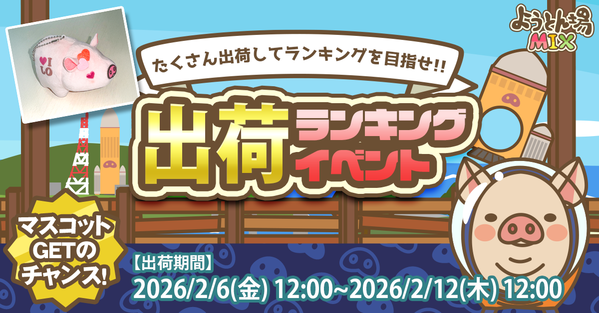 エントリー後の出荷総数ランキングで特定の順位の方200名に恋愛豚のマスコットをプレゼント!さらに出荷頭数に応じて景品ももらえるぞ!